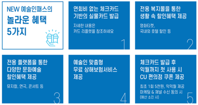 √ 예술인 패스 소지자라면 누구나 신청 가능하며, 별도의 연회비 없이 캐시백을 비롯한 다양한 혜택을 누릴 수 있는 예술인 패스 체크카드