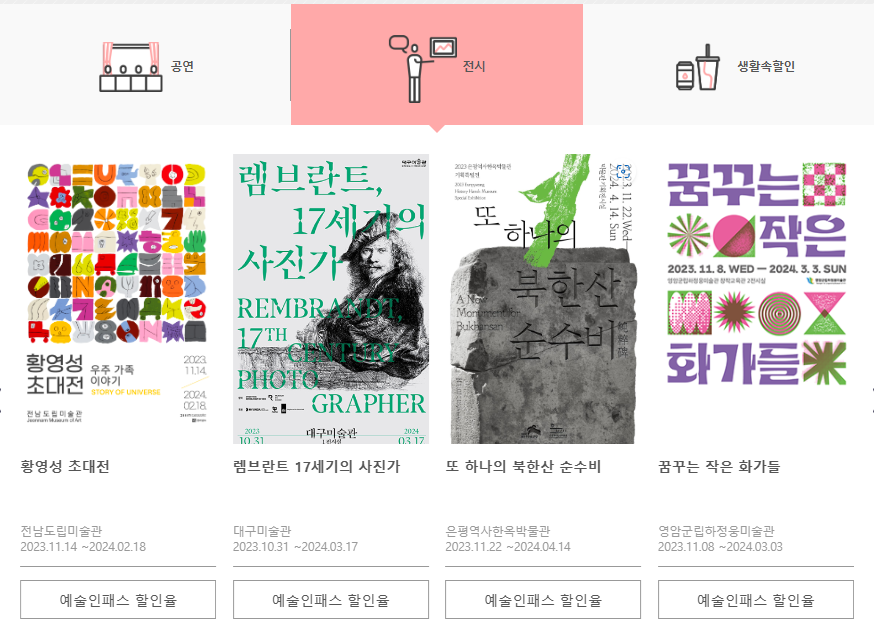 ➁ 예술인패스 전용 예매사이트 제공: 공연/전시 할인, 초대행사, 기획전 등 다양한 이벤트 제공