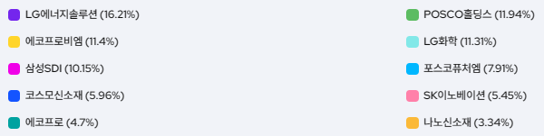 투자 구성 종목을 보면 LG에너지솔루션 16.21%, POSCO홀딩스 11.94%, 에코프로비엠 11.4%로 종목을 구성하고 있고, 연 4회 지수 변경을 실시하고 있어, 2차 전지산업에 집중적으로 투자하고 있는 것으로 보인네요.