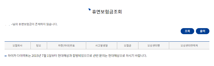 - 자동차보험 휴면보험금 조회 클릭 후 결과를 확인
