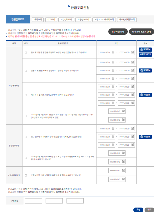 - 가입경력과 보험사기피해 관련 이외 환급신청 : 현재 신청일 기준 과거 5년 내 체결된 보험 계약 건