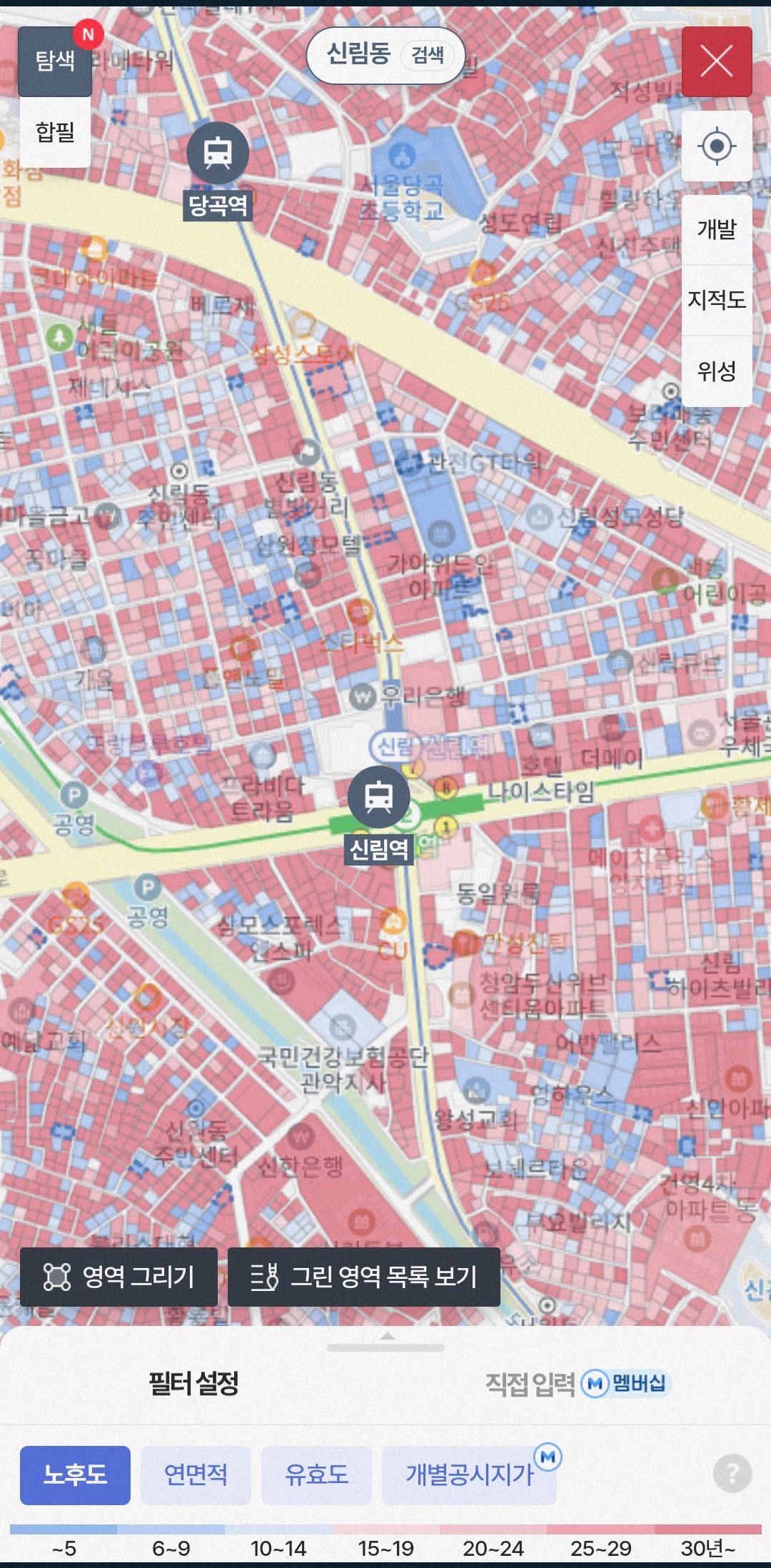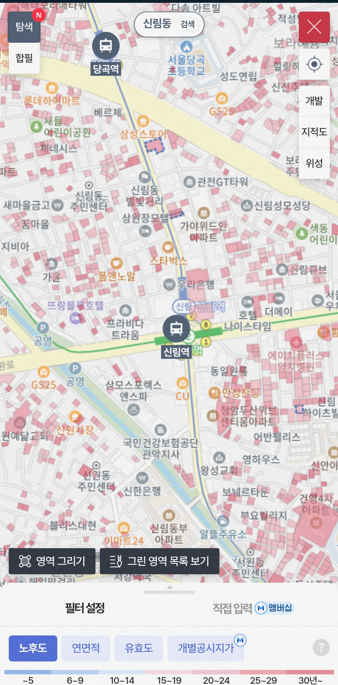 - 노후도를 더욱 자세하게 검색하고 싶다면 건축연한을 20~30년으로 필터링하여 검색하면, 재개발의 기준에 만족하는 조건으로 검색이 가능하네요.