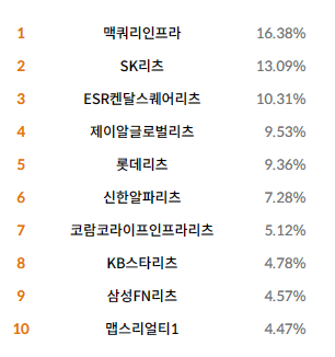 KODEX 한국부동산리츠인프라는 맥쿼리인프라, ESR 켄달스퀘어리츠, SK링츠, 신한알파리츠 순으로 상위 5개 종목에 64% 수준을 투자하고 있네요.
