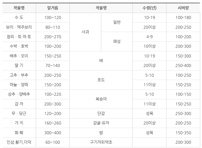 - 작물별 시비량은 일반토양 기준이므로 재배토양의 상태나, 작물의 품종에 따라 가감하여 사용하십시오