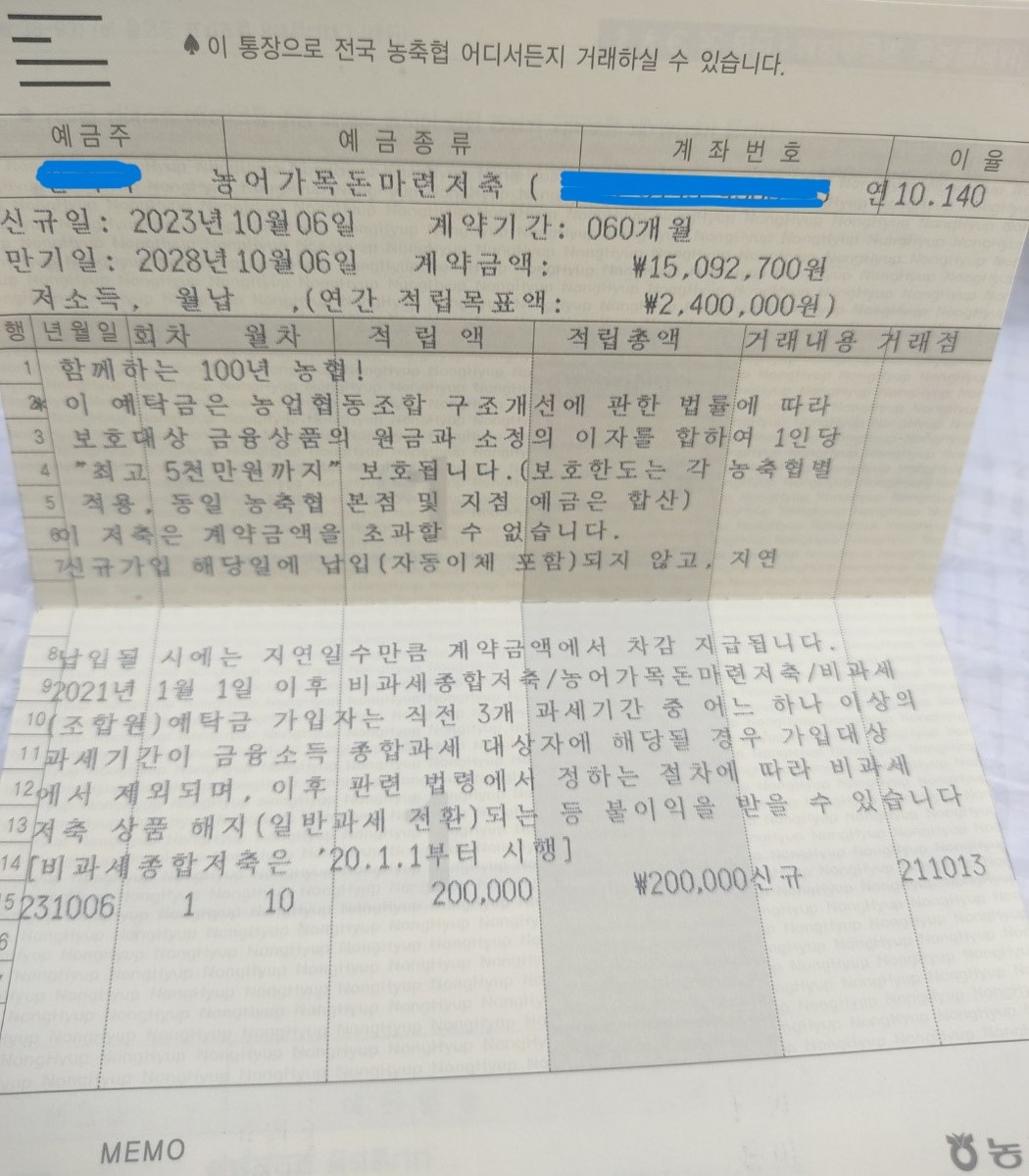 이 농어가 목돈마련저축은 월 20만원을 5년동안 1,200만원 납부하면 300만원의 이자와 장려금을 지원 받아 1,500만원의 목돈으로 돌려 받을 수 있으며, 비과세 상품으로 이자에 대한 세금이 없고, 안정성이 높은 최고의 재테크 방법이지 않나 싶어 적극 추천 드려요.