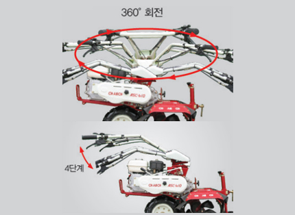AMC - 630M 모델은 위의 특징 외에도 일륜 바뀌로 구성되어 있어 젊은 사람들이 농사짓는데 적합하다고 할 수 있으며, 작업 중 돌발상황이 발생 시 안전레버를 눌러 원터치로 작업을 중지할 수 있어 안전하고 편리하네요.