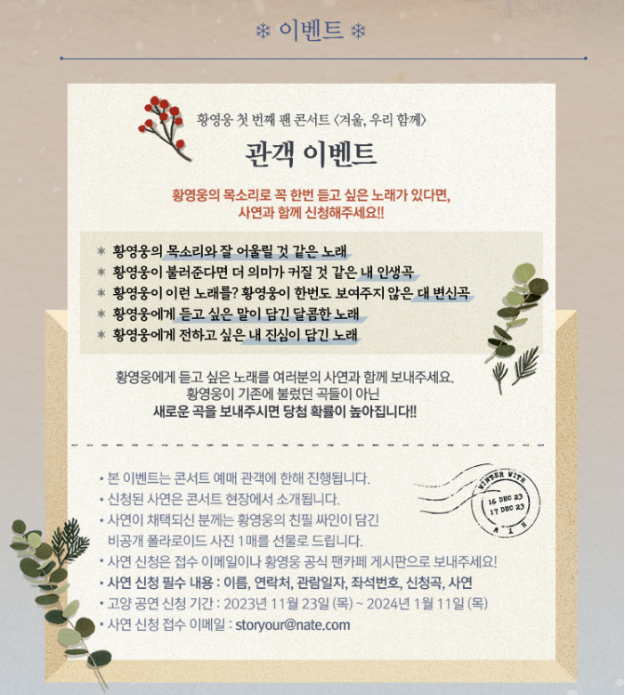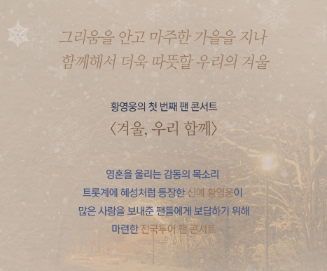 이 황영웅의 첫 번째 팬 콘서트라니, 많은 분들이 황영웅의 콘서트를 기대하고 있을 것으로 아는데요. <겨울, 우리 함께>의 스토리로 콘서트를 준비했다니 티켓팅 방법에 대해 좀 더 자세하게 알아보도록 하겠습니다.