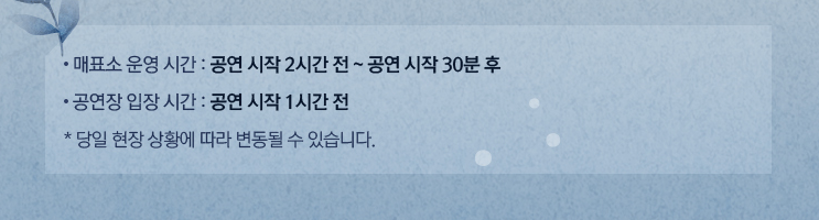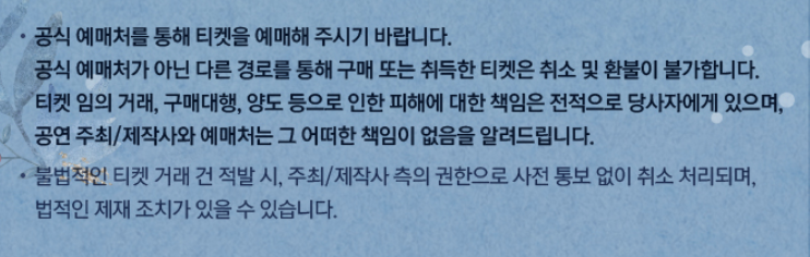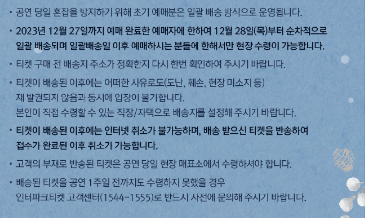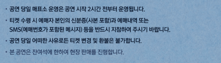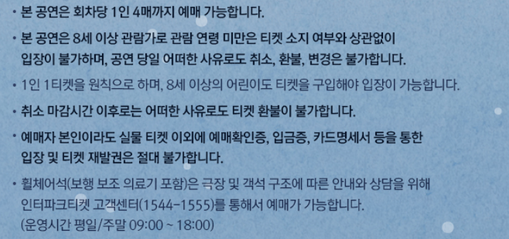 ※ 장애인 할인받은 티켓은 현장수령만 가능하며, 할인증빙서류(복지카드) 미지참 혹은 할인 대상자 본인이 아닌 경우 할인받은 금액 지불 후 티켓수령가능합니다.